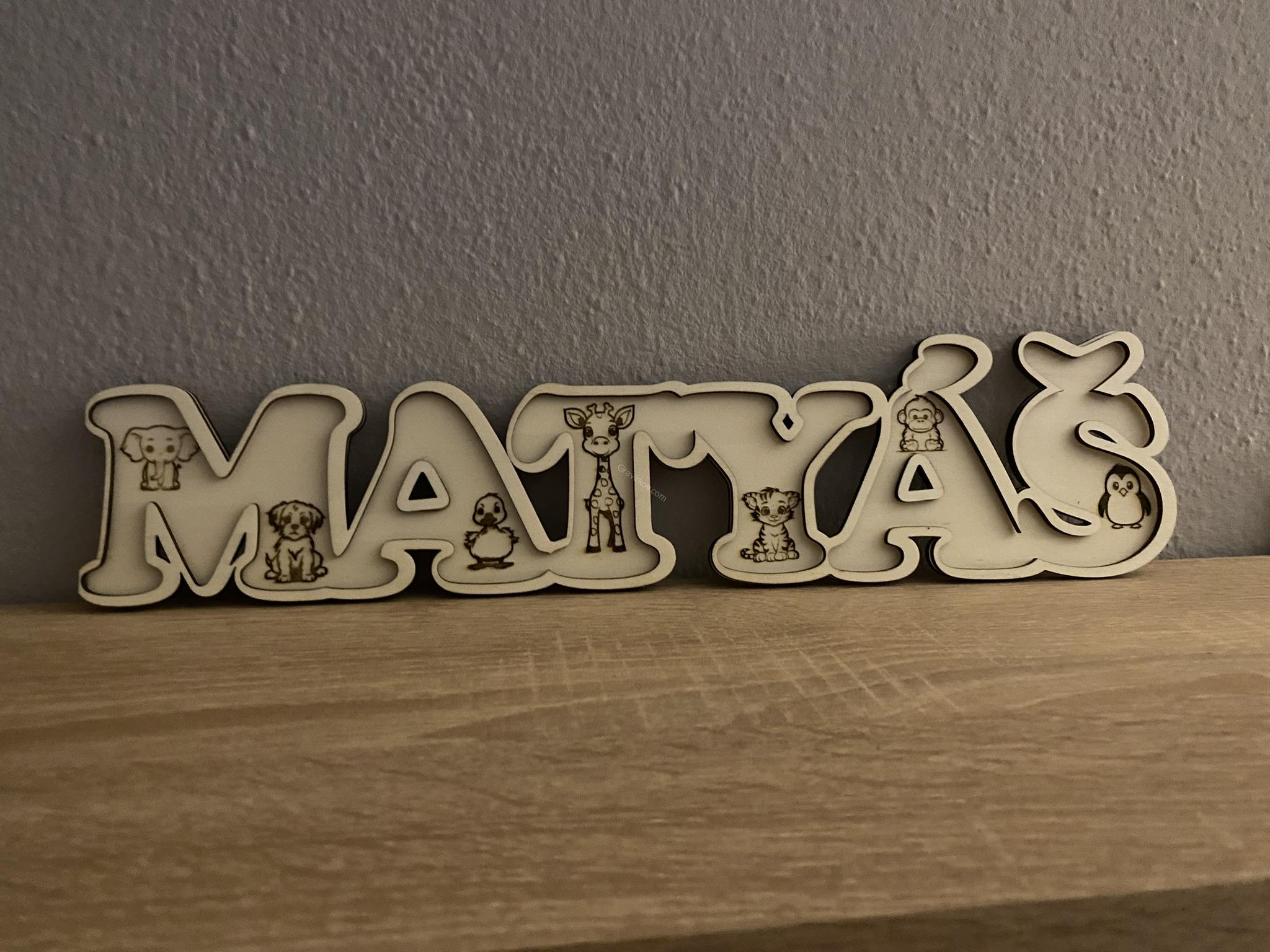 Laserem gravírované a vyřezávané jméno z topolové překližky o tloušťce 3 mm a rozměrech 39 x 10 x 9 cm. Tento produkt je ideální dekorací do dětského pokoje, kde se stane výrazným a osobitým prvkem. Jméno je precizně vyřezáno a doplněno jemnými gravírovanými obrázky zvířátek dle vašeho výběru, jako jsou sloneček, pejsek, kačenka, žirafa, tygřík a další.