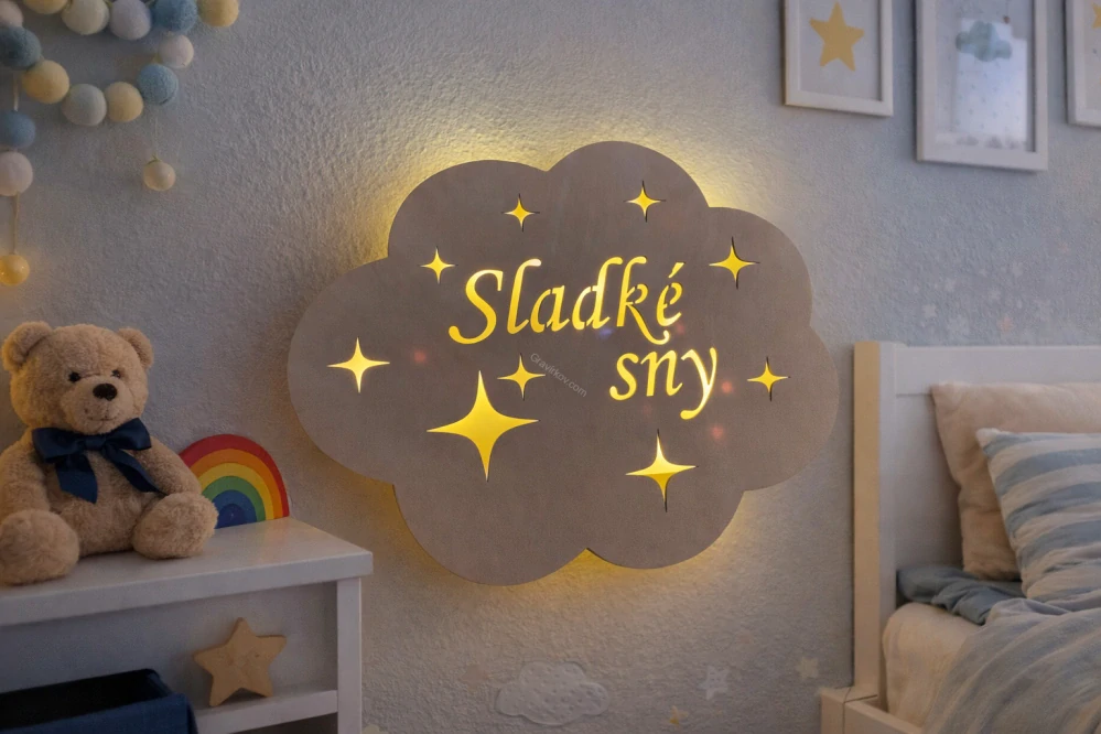 Lampička je vyrobena z kvalitní březové překližky o tloušťce 3 mm, která je lehká, pevná a má jemnou přírodní kresbu. Díky preciznímu laserovému vyřezávání vznikají jemné detaily, kterými světlo krásně prosvítá a vytváří uklidňující světelný efekt. Celkové rozměry lampičky jsou cca 38,5 × 29,5 × 3 cm, takže se stane výrazným, ale stále harmonickým prvkem dětského pokoje.