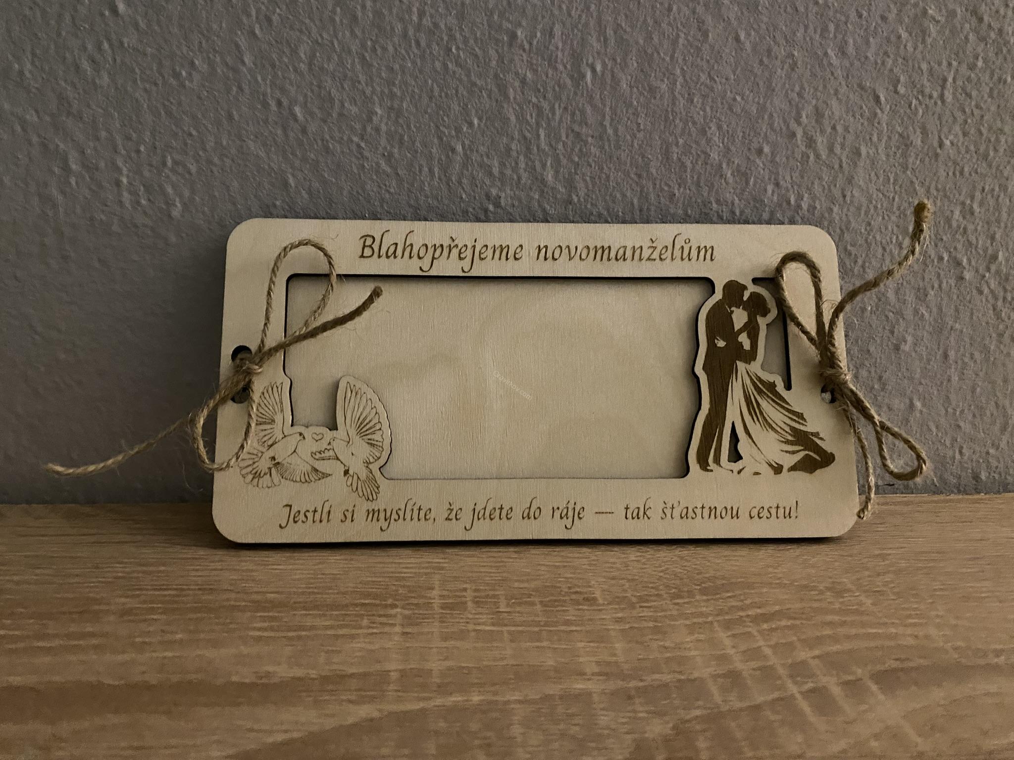 Darujte peníze stylově a originálně! Naše dřevěné přání na bankovky – ke svatbě 01 je elegantním způsobem, jak novomanželům předat finanční dar. Spojuje v sobě krásný přírodní vzhled, precizní zpracování a hravou symboliku – z vložených bankovek totiž může vzniknout jejich „první společný milion“.