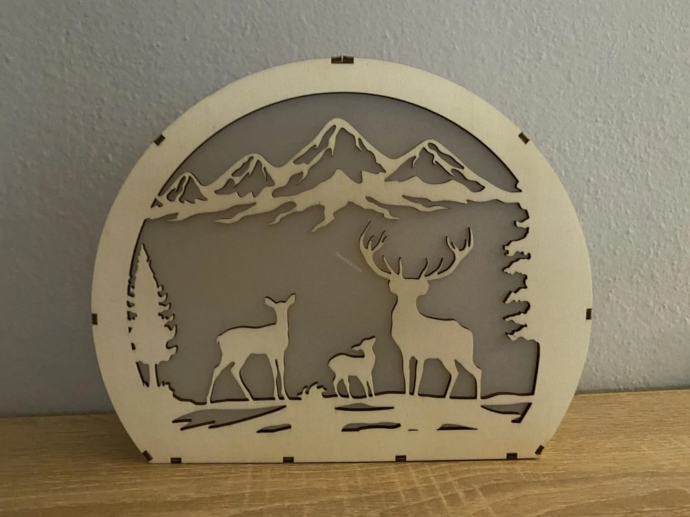 Každá lampa je precizně vyřezána laserem z kvalitní topolové překližky o tloušťce 3 mm, která vyniká jemnou strukturou, lehkostí a přirozeným odstínem dřeva. Motiv lesa vytváří po rozsvícení nádhernou hru světla a stínů, která připomíná klid lesní krajiny.