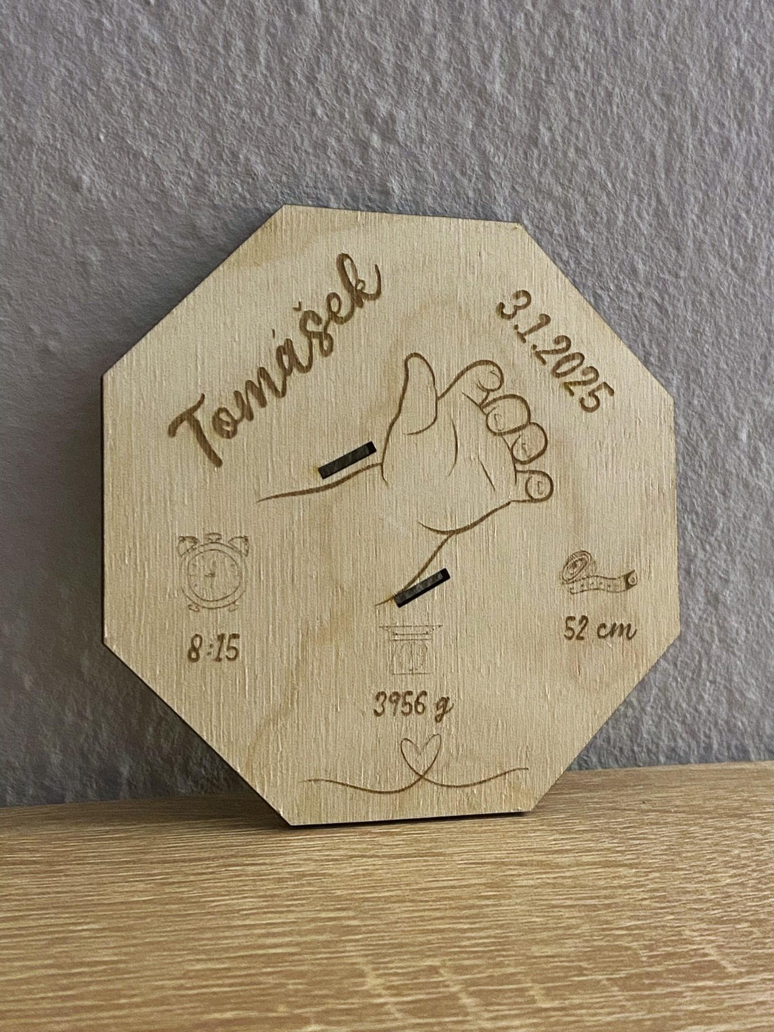 Tato pamětní deska není jen krásnou dekorací, ale především cenným strážcem vzpomínek na první okamžiky Vašeho miminka. Kombinace přírodního materiálu a pečlivého zpracování vytváří nadčasovou památku, ke které se budete rádi vracet.