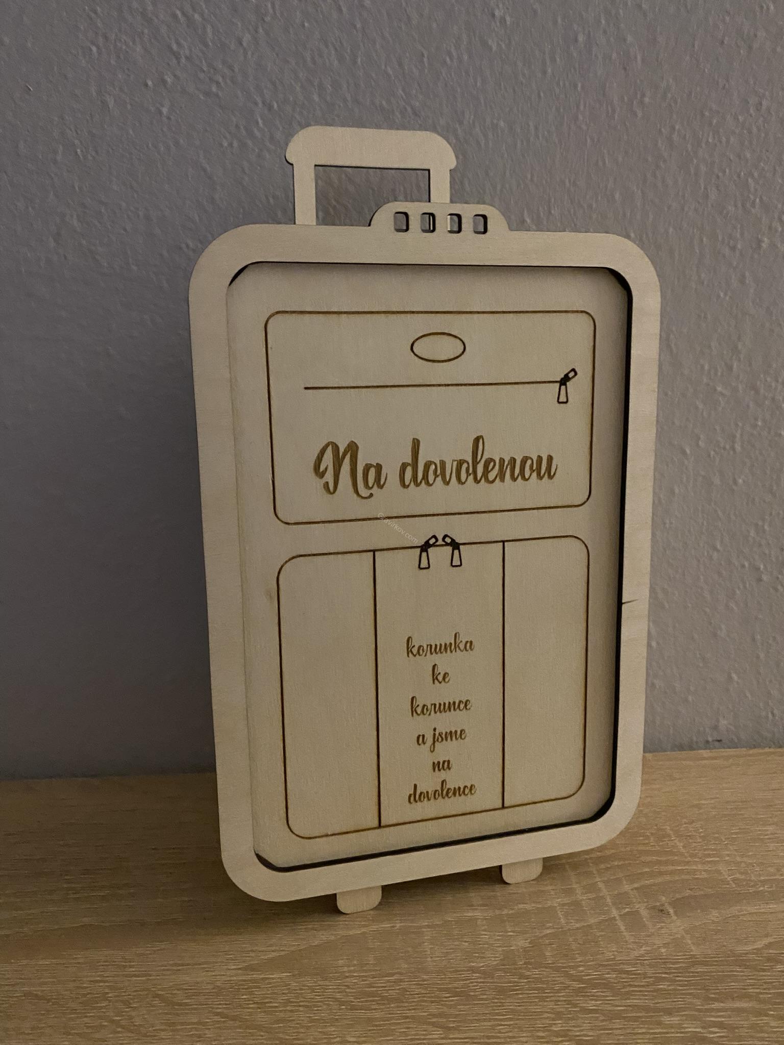 Dřevěná pokladnička ve tvaru kufru – originální dárek s gravírováním