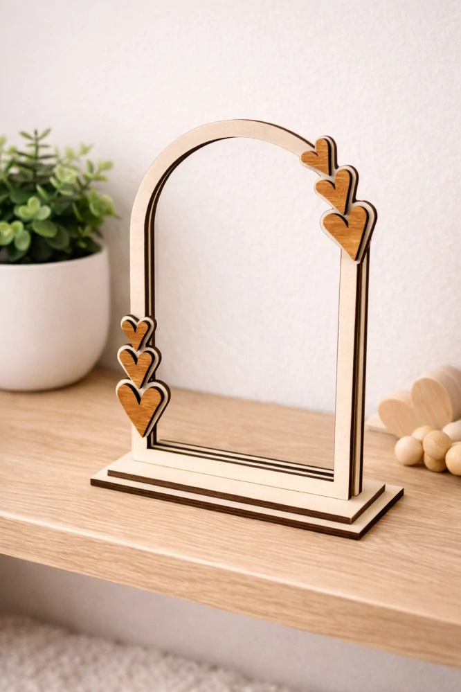 Rámeček je vyroben z kvalitní březové překližky o tloušťce 3 mm, která vyniká pevností, jemnou kresbou a světlým přírodním odstínem. Precizní laserové vyřezávání zajišťuje čisté linie a detailní motiv srdíček, které dodávají rámečku jemný a romantický vzhled. Celkové rozměry rámečku jsou cca 15 × 10 × 4 cm a je určen pro fotografii o velikosti 15 × 10 cm.